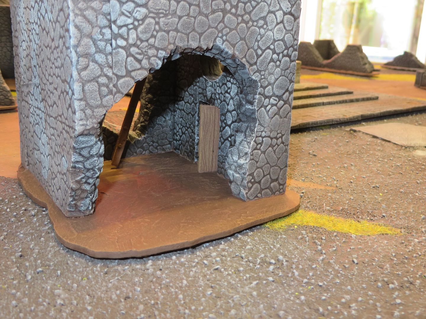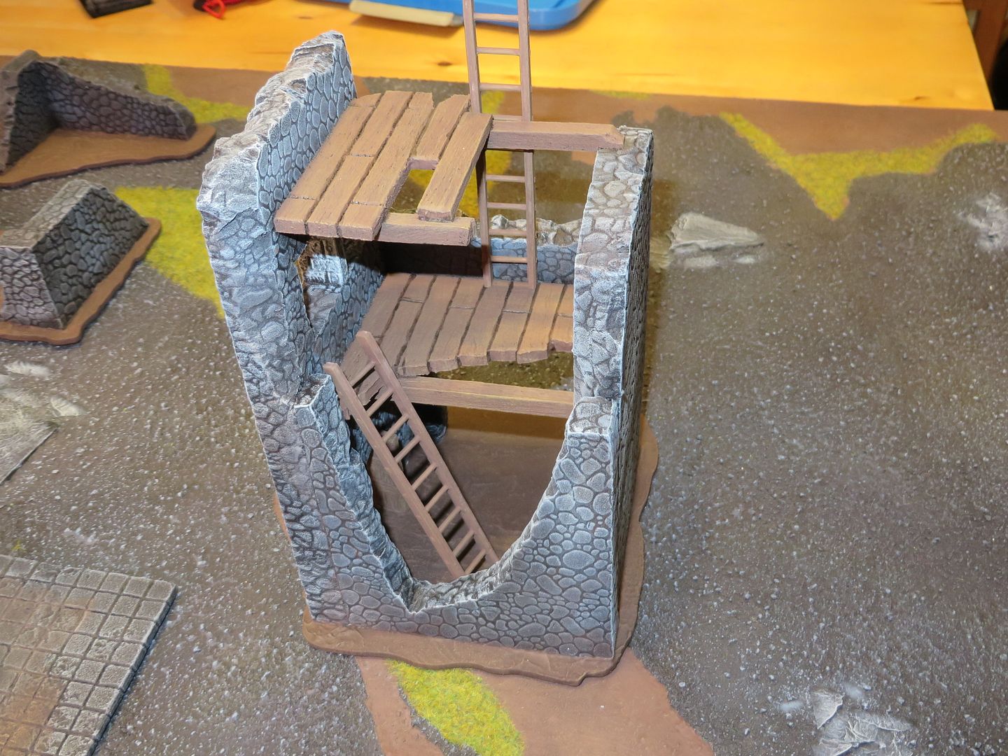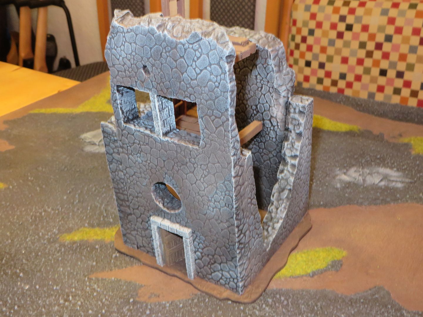 Der Turm war das letzte Gebäude was ich angefangen hatte und ist dementsprechend schon etwas komplizierter aufgebaut. Die Schwierigkeit bestand darin den Turm über mehrere Ebenen spielbar zu machen, gleichzeitig aber auch genügend Platz für wulstige Spielerfinger zu lassen um die Minis auch bewegen zu können. Aus diesem Grund habe ich viele Einbrüche eingebaut und die beiden oberen Etagen entsprechend so verkleinert, das man gut an seine Figuren rann kommt. Zur bemalung kann ich sagen das ich den kompletten Turm inklusive beider Holzetagen erst zusammengebaut und bemalt habe und erst dann die Base angebracht habe. Dadurch hatte ich wesendlich mehr Spielraum beim bemalen und kam besser an die Innenwände. Bei noch höheren Gebäuden würde ich eventuell noch obere Etagen erst später anbringen, aber auch nur wenn ich weiß das ich sie später noch ohne Probleme eingesetzt bekomme. Bei der ersten Etage in meinem Turm wäre das beispielsweise nicht gegangen.