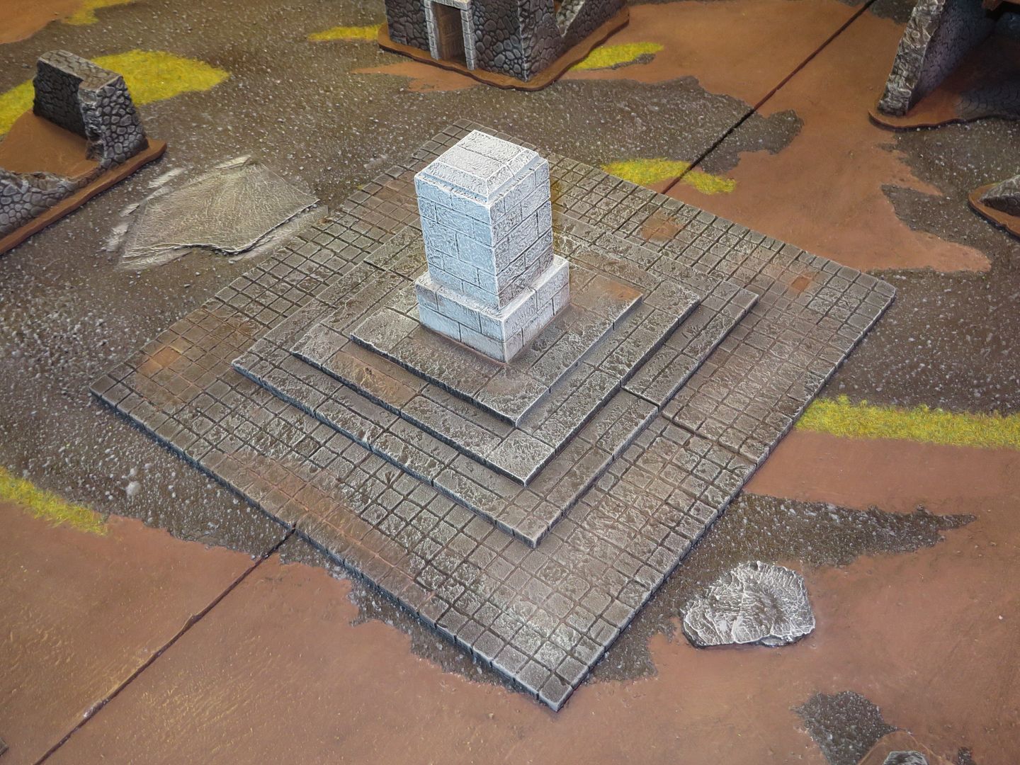 Marktplatz mit Sockel/Monument. Geplant ist es noch 4 weitere kleine Sockel zu basteln um noch mehr Sichtblocker und Deckung zu ermöglichen, Momentan ist es in erster Linie nur ein super Füller für einen ansonsten offenen Platz auf dem Spielfeld. Hier habe ich mal ein paar "richtige Steine" struckturiert um das Monument vom Rest des Geländes abzuheben und das ganze dann bei der Bemalung noch weiter hervorgehoben. Die Steinplatten auf dem Boden sind wiederum einfach dem Universalstruckturierer zum Opfer gefallen und danach grob in einzelne Platten unterteilt worden. Dabei kam es zu einigen "Ungenauigkeiten" *hust* die ich aber einfach so belassen habe statt nochmal neu anzufangen. Da hat man wohl einmal den Steinmetzlehrling dran gelassen und alles geht schief